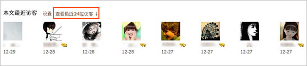 黄钻用户QQ空间的单篇日志可以显示本文访客功能:请登录到您的QQ空间,点击您某篇日志,日志正文下方会显示本文最近访客。如图: